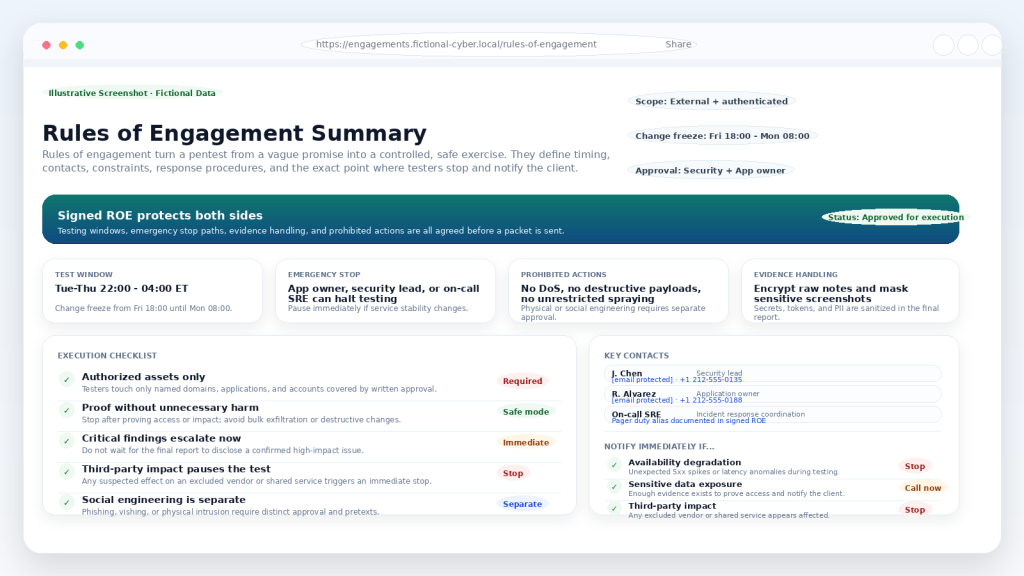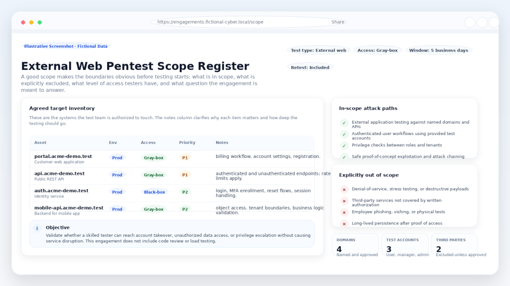 Note: All screenshots in this article are illustrative examples built from fictional data. They are included to show what good scope, rules of engagement, and service-selection artifacts can look like.