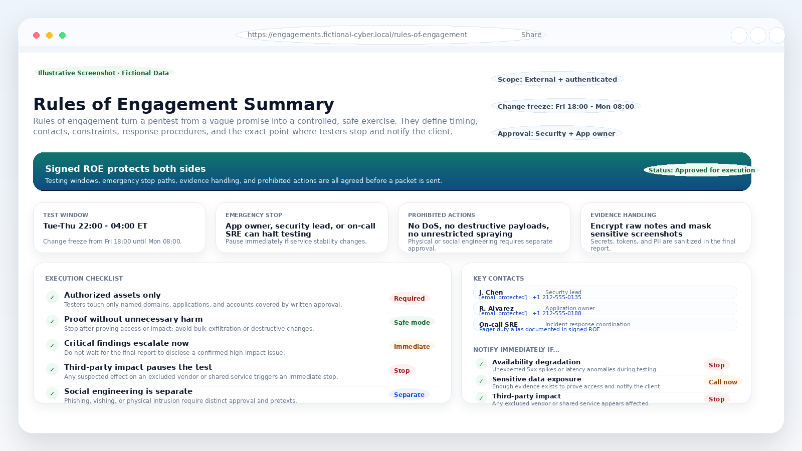 Figure 2. Illustrative screenshot: a fictional rules-of-engagement summary covering timing, stop conditions, contacts, and notification triggers.